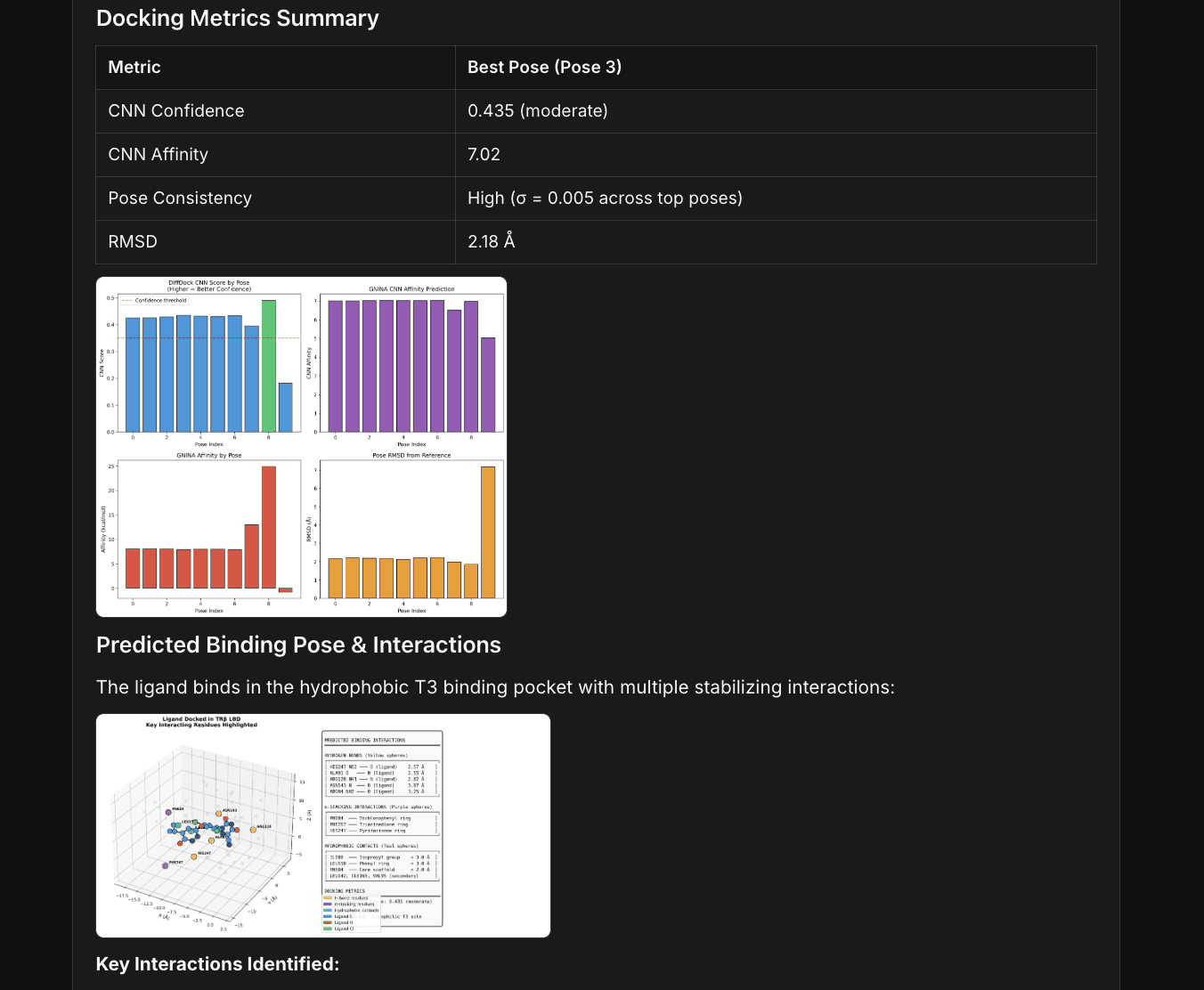 Uses computational docking methods to predict ligand–target binding poses and interactions, and supports binding affinity prediction through frontier models such as Boltz-2.
